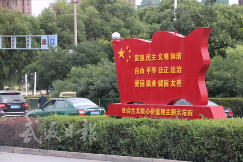 7月24日,武威城区祁连大道东口醒目的“社会主义核心价值观”宣传牌。创城工作开展以来,以“社会主义核心价值观”等为主要内容的公益宣传,已成为武威大街小巷的一道靓丽风景线。