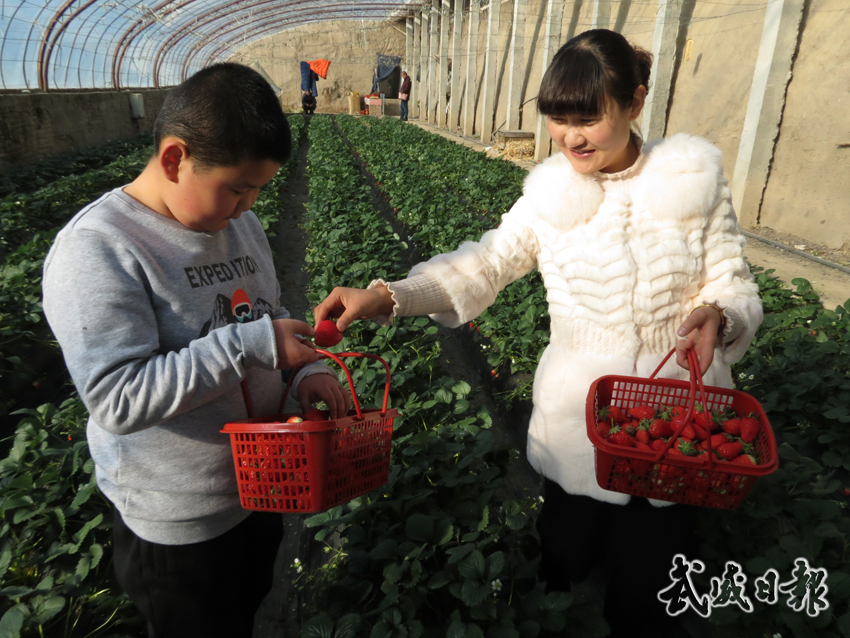 2017年12月24日,市民采摘草莓。武威金帆农业科技有限公司引进先进草莓栽培技术,种植的7座草莓采摘棚目前进入采摘期,吸引了市民前来采摘。